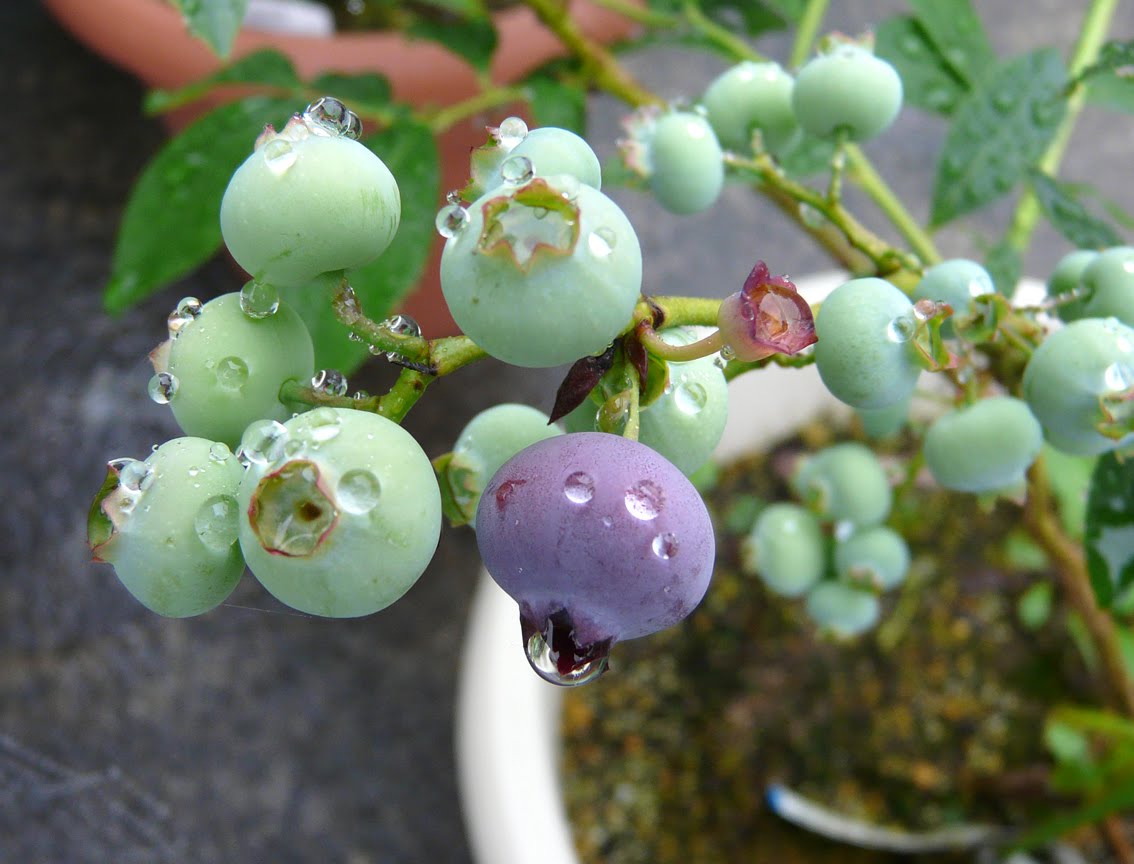 梅雨の合間に見たら、パトリオットの実が2個紫色になっていました。まだ大部分は青い小さな実ですが。